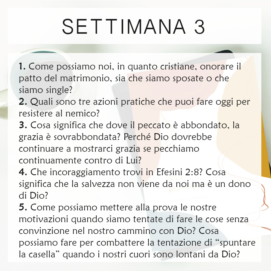 Oggi, approfitta per rileggere i brani principali della settimana e rispondi alle domande di riflessione che ti proponiamo. Puoi annotare le risposte su un quaderno e condividerle con chi vuoi!
