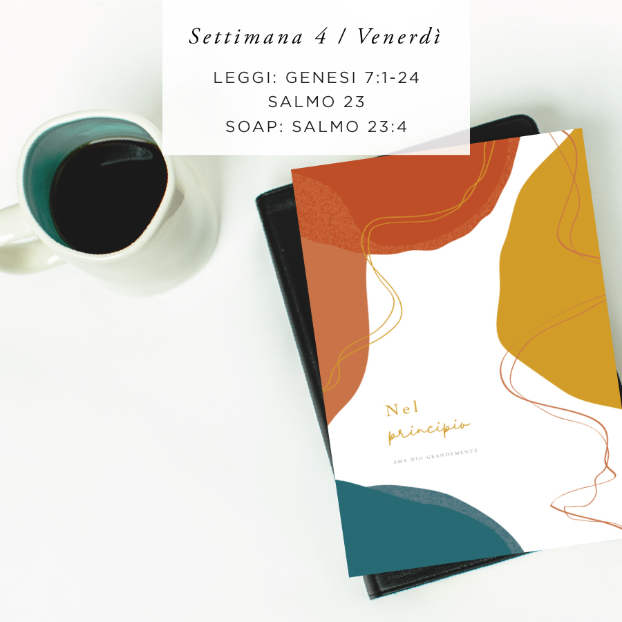 Dio distrusse ogni essere vivente, ma salvò Noè e la sua famiglia. Dio fu con loro guidandoli in mezzo alle tenebre. Ognuna di noi ha affrontato periodi di paura paralizzante. Quando siamo in valli profonde per un dolore, una perdita, un peccato, una paura o una oppressione, il nostro Dio rimane lo stesso. Egli è il Pastore che si prende cura di noi. Egli è l'Unico che può guidarci verso l'abbondanza. Egli ci aiuta nei momenti in cui ci sentiamo deboli e stanche, dandoci la forza necessaria e mostrandoci la giusta via.