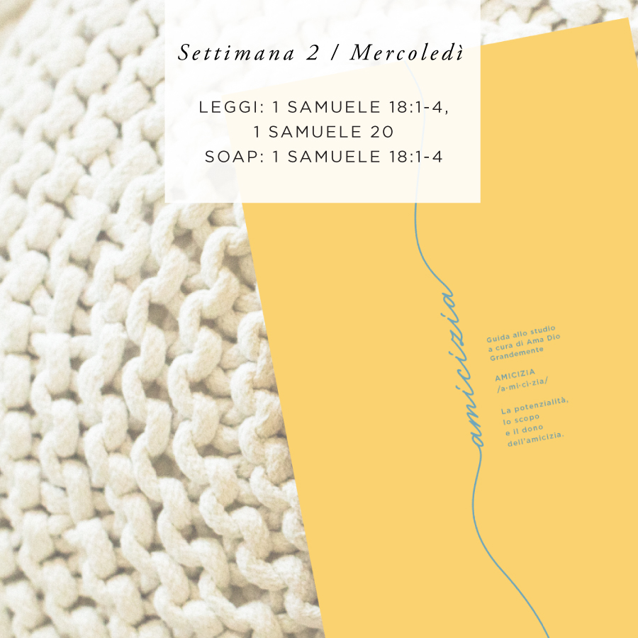 Pochi di noi penserebbero di fare un'alleanza con i nostri amici! Davide e Gionatan sono un buon esempio di quanto possa essere forte un'amicizia quando è radicata nell'amore reciproco per Dio. Anche quando Saul, il padre di Gionatan, voleva uccidere David, Gionatan è rimasto fedele al suo amico. Può sorprendere molte di noi pensare che la nostra fede potrebbe chiederci di essere più fedeli ai nostri amici che alla nostra famiglia! Il Nuovo Testamento porta questo esempio anche oltre. Il popolo di Dio non è più definito dalla nascita nella popolazione di Israele, ma dall'accettazione nella famiglia di Dio.