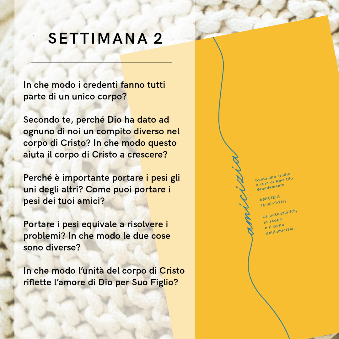 Con la guida allo studio ‘Amicizia’ potrai scoprire il significato profondo di questo termine secondo la Parola di Dio. Questo studio mette in evidenza il nostro bisogno di comunità, la meravigliosa benedizione dell’amicizia, come riconoscere un’amicizia tossica ed evitarla e come possiamo trovare la nostra migliore amicizia in Colui che ha dato la vita per i Suoi amici.