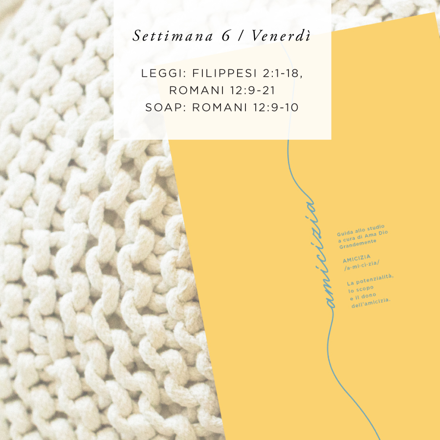 Con la guida allo studio ‘Amicizia’ potrai scoprire il significato profondo di questo termine secondo la Parola di Dio. Questo studio mette in evidenza il nostro bisogno di comunità, la meravigliosa benedizione dell’amicizia, come riconoscere un’amicizia tossica ed evitarla e come possiamo trovare la nostra migliore amicizia in Colui che ha dato la vita per i Suoi amici.