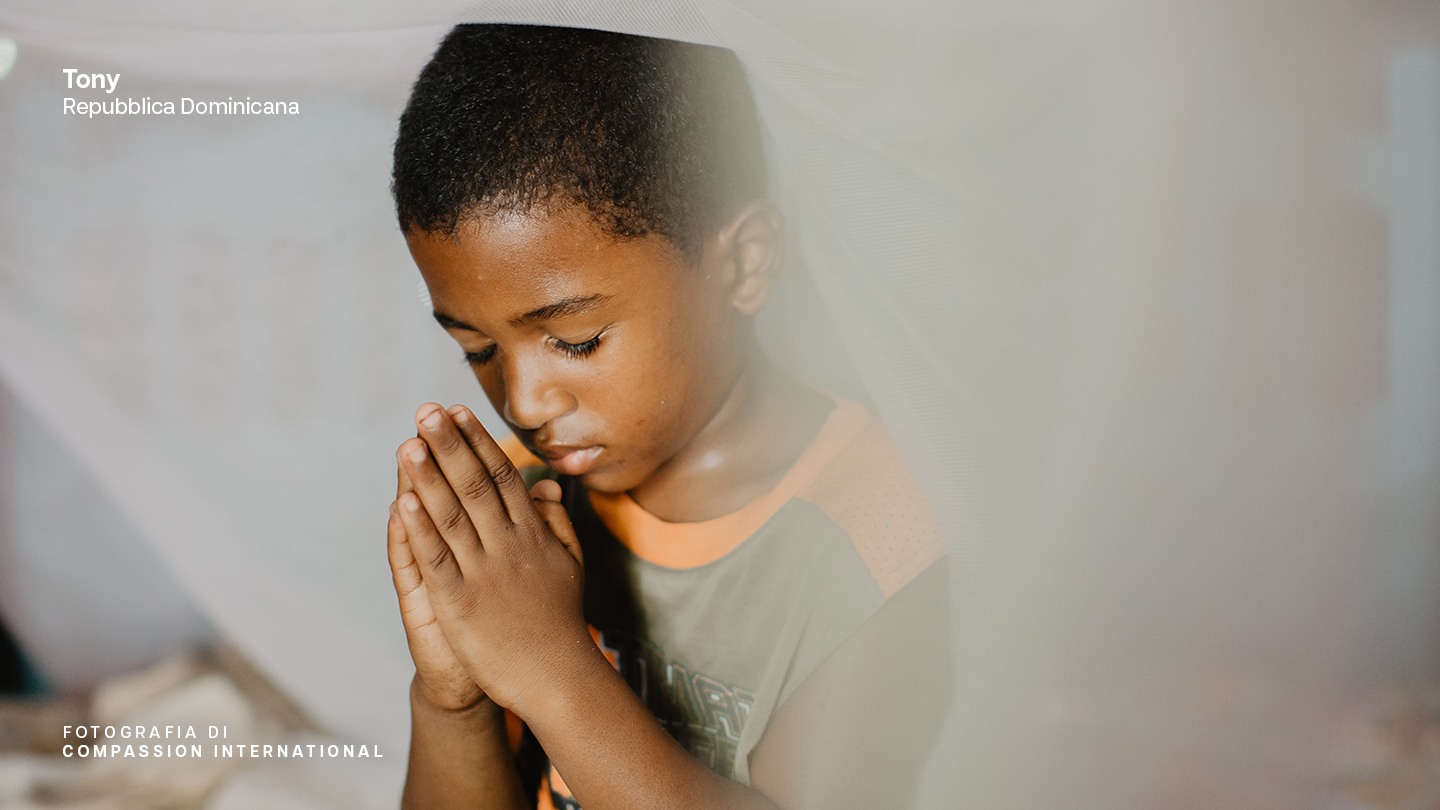 Foto: Tony, in Repubblica Dominicana, ringrazia Dio. Ha ricevuto delle zanzariere da Compassion, per essere protetto dalla malaria.