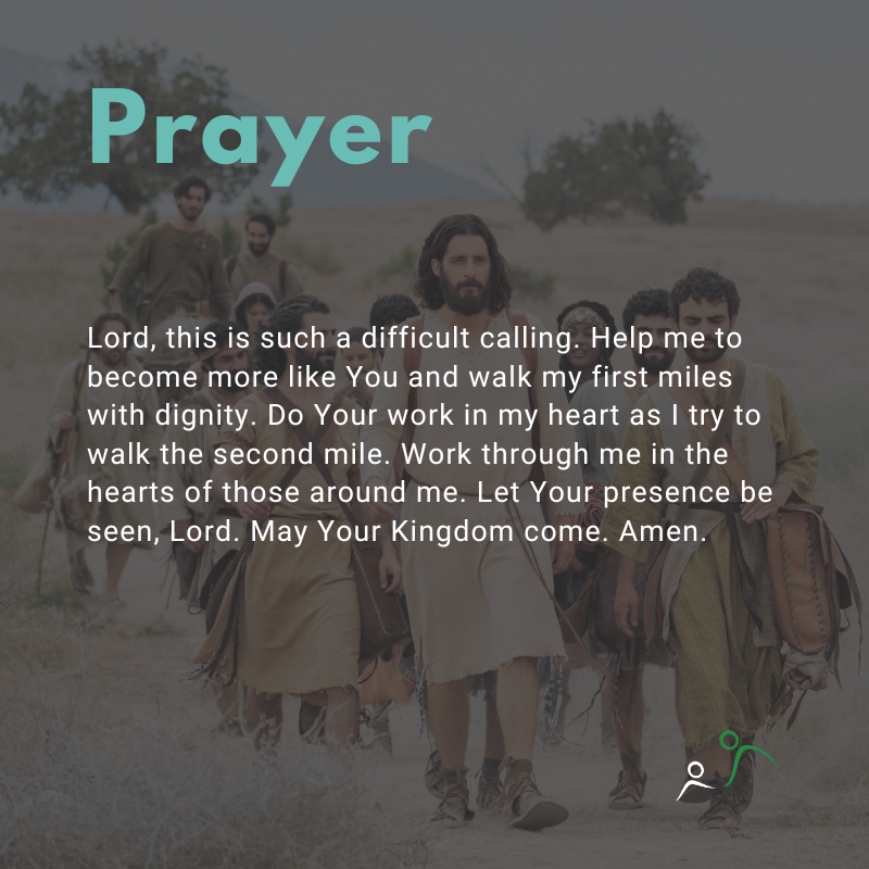 Lord, this is such a difficult calling. Help me to become more like You and walk my first miles with dignity. Do Your work in my heart as I try to walk the second mile. Work through me in the hearts of those around me. Let Your presence be seen, Lord. May Your Kingdom come. Amen.