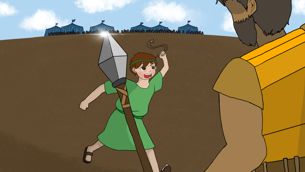 칼과 창이 없어도 하나님의 이름으로 당당하게 나온 다윗은 물매와 돌 하나로 골리앗을 쓰러뜨렸어요.