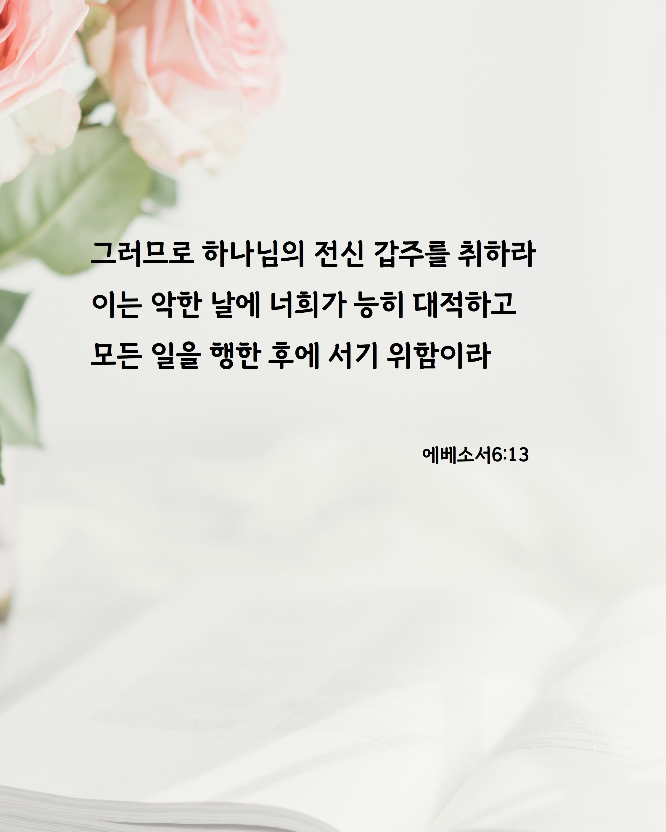 예수님, 원수의 계략에 맞서 싸울 수 있도록 아버지의 갑옷을 우리에게 주심에 감사합니다. 저를 강하게 하시고, 굳게 서서 하나님의 전신 갑주를 사용할 수 있도록 도우소서. 예수님 이름으로 기도드립니다. 아멘