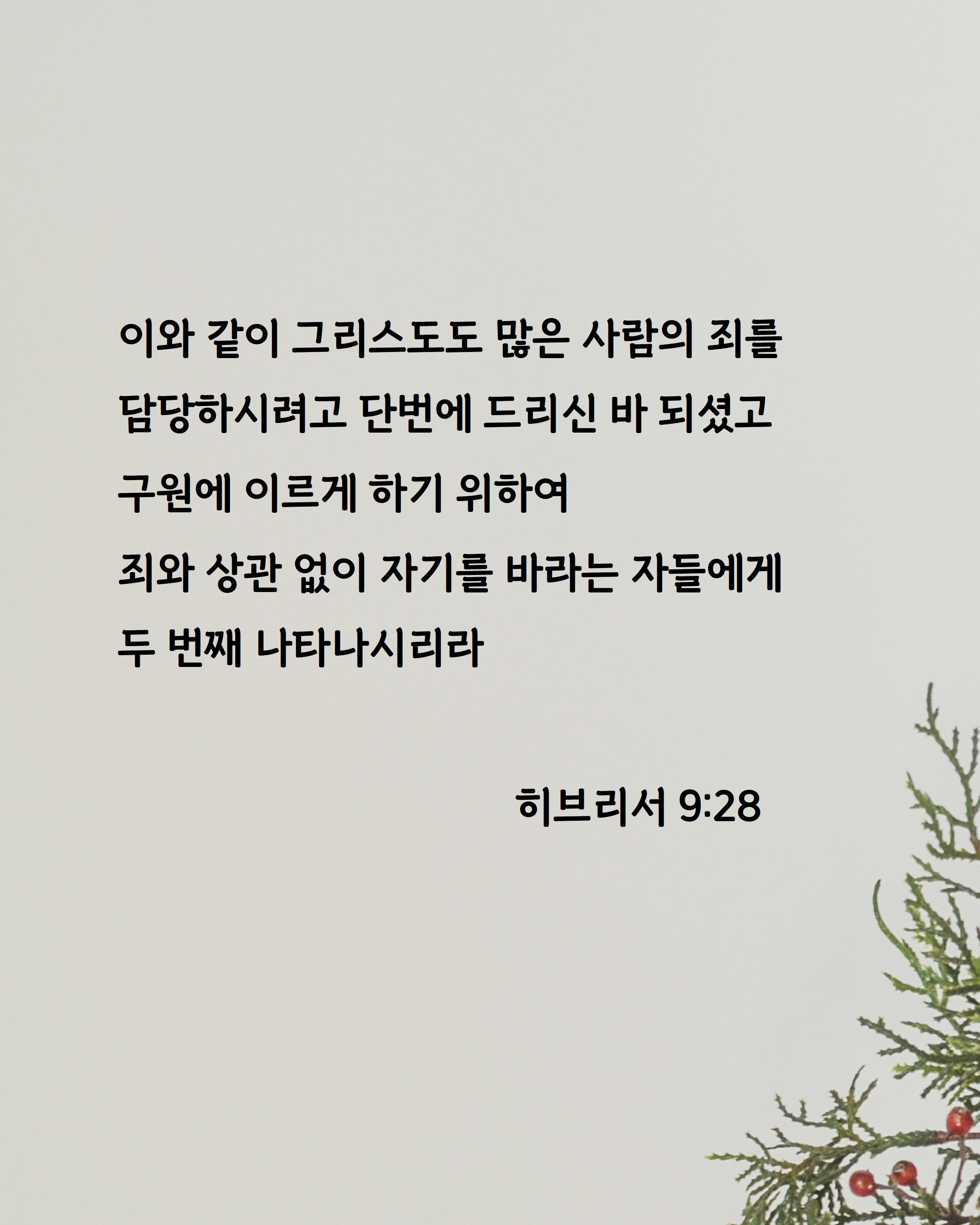 주님, 제가 결코 할 수 없었던 일을 해 주셔서 감사합니다. 제 죄를 지시고 하나님과 화목할 수 있도록 길을 열어주시니 감사합니다. 예수 안에서 안식하며 그 안에서 살도록 하소서. 아멘