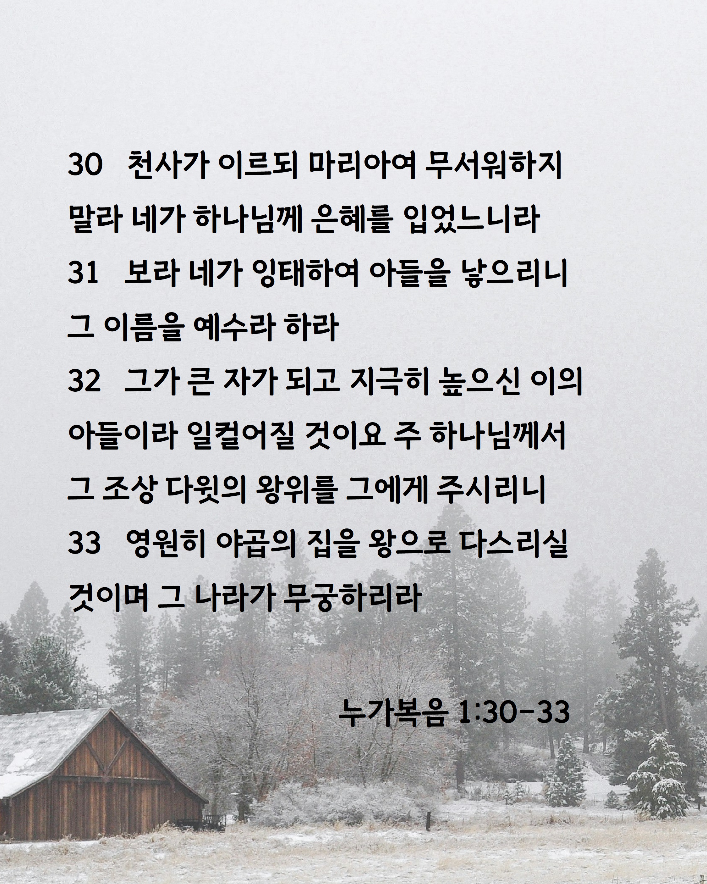 천사가 전한 메시지는 마리아의 삶을 바꾸는 것뿐 아니라 세상을 바꾸는 것이었습니다. 세대가 기다려온 메시아, 온 세계의 소망이 오고 있었습니다. 단순이 영적으로 온 것이 아닌 육신의 모습, 아기로 오고 있었습니다.