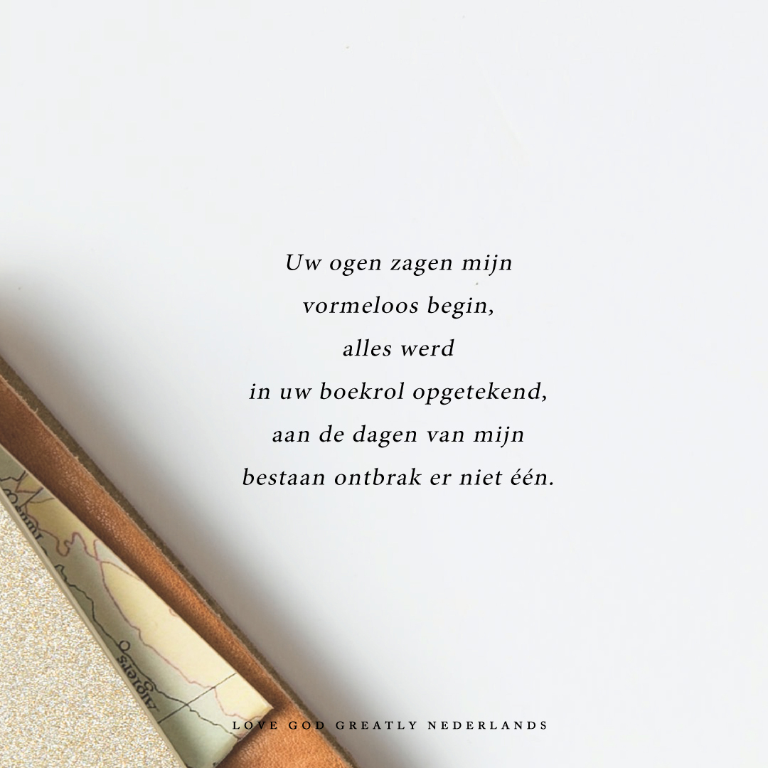 Lees deze week Psalm 139. Overdenk het feit dat God jou volledig kent. Hij kent je door en door en houdt nog steeds van je. Neem deze week de tijd om over deze waarheid na te denken. Vraag God je Zijn vrede te geven in de geruststellende wetenschap dat Hij je volledig kent en jou volmaakt liefheeft!