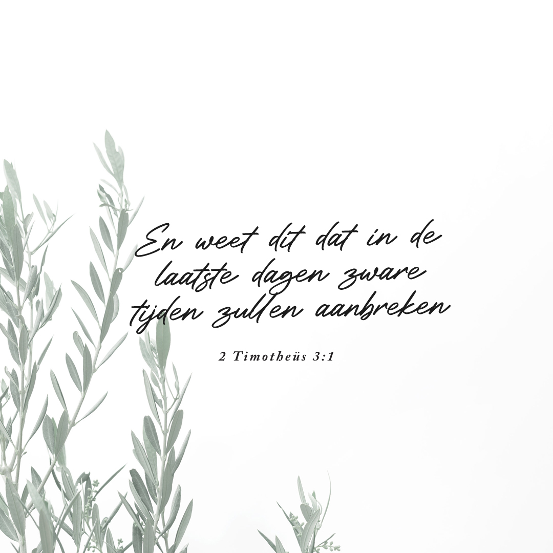 Deze opsomming van karaktereigenschappen van de mensen in de laatste dagen is niet bepaald bemoedigend. Merk je hoe dringend Paulus dit schrijft? Het lijkt alsof hij denkt dat die ‘laatste dagen’ al zijn aangebroken, maar hij schreef dit tweeduizend jaar geleden. Dat komt omdat de term ‘laatste dagen’ in het Nieuwe Testament gebruikt wordt voor de tijd die begint bij de Hemelvaart van Jezus en Pinksteren, en eindigt met Zijn wederkomst. Wij leven allemaal in de laatste dagen.