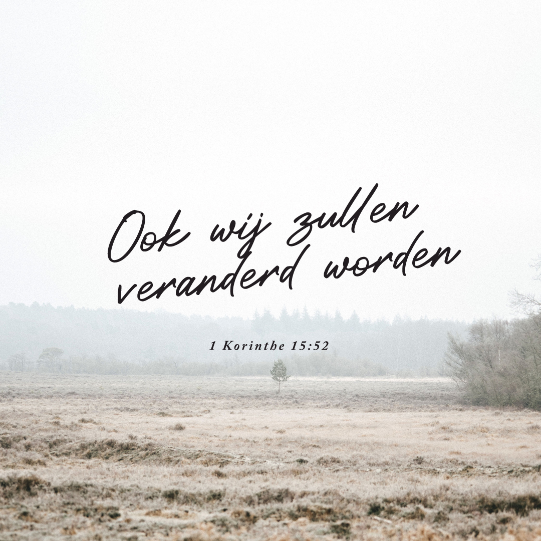 Zie, ik vertel u een geheimenis: Wij zullen wel niet allen ontslapen, maar wij zullen allen veranderd worden, in een ondeelbaar ogenblik, in een oogwenk, bij de laatste bazuin. Immers, de bazuin zal klinken en de doden zullen als onvergankelijke mensen opgewekt worden, en ook wij zullen veranderd worden.