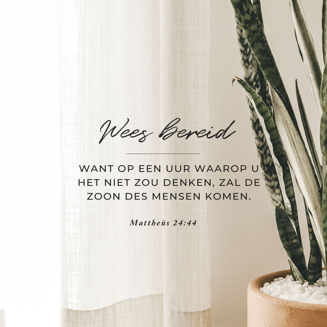Wees dan waakzaam, want u weet niet op welk moment uw Heere komen zal. Maar weet dit, dat als de heer des huizes geweten had in welke nachtwake de dief komen zou, hij waakzaam geweest zou zijn, en niet in zijn huis zou hebben laten inbreken. Weest ook u daarom bereid, want op een uur waarop u het niet zou denken, zal de Zoon des mensen komen.