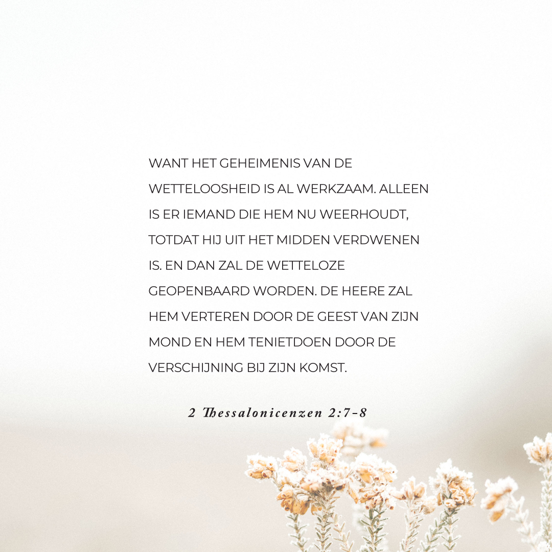 4.Op welke manier zal de Heer volgens 2 Thessalonicenzen 2:7-8 de wetteloze tenietdoen? Wat leert dit ons over onze Heer?
