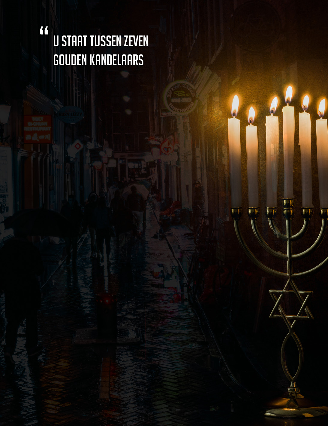 Het is heel mooi dat God aan Johannes het beeld van kandelaren laat zien. Bekijk de mooie menora. Het doel van een kandelaar is licht verspreiden. Precies zoals Jezus het zegt in Matteüs 5 vers 14 (HSV): "U bent het licht van de wereld."