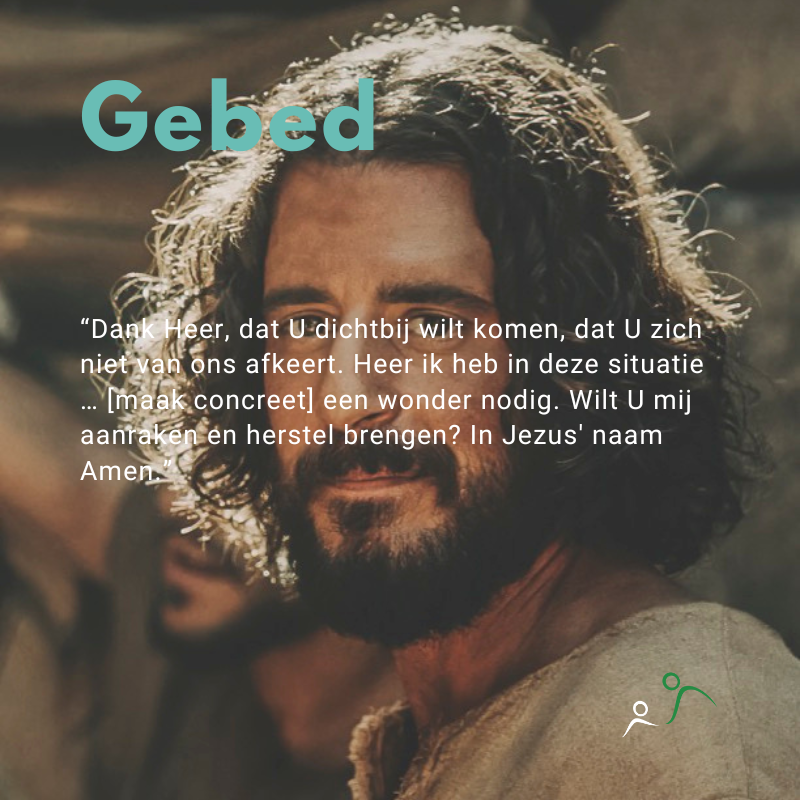 “Dank Heer, dat U dichtbij wilt komen, dat U zich niet van ons afkeert. Heer ik heb in deze situatie … [maak concreet] een wonder nodig. Wilt U mij aanraken en herstel brengen? In Jezus' naam Amen.”