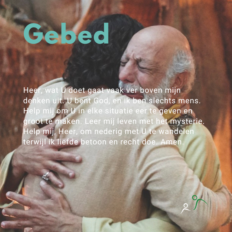 Heer, wat U doet gaat vaak ver boven mijn denken uit. U bent God, en ik ben slechts mens. Help mij om U in elke situatie eer te geven en groot te maken. Leer mij leven met het mysterie. Help mij, Heer, om nederig met U te wandelen terwijl ik liefde betoon en recht doe. Amen.