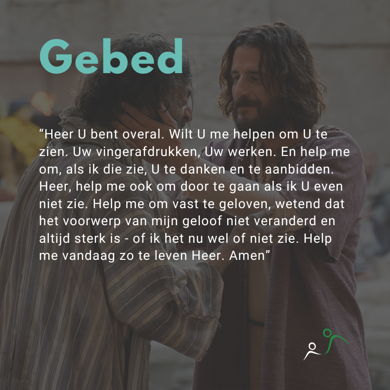 “Heer U bent overal. Wilt U me helpen om U te zien. Uw vingerafdrukken, Uw werken. En help me om, als ik die zie, U te danken en te aanbidden. Heer, help me ook om door te gaan als ik U even niet zie. Help me om vast te geloven, wetend dat het voorwerp van mijn geloof niet veranderd en altijd sterk is - of ik het nu wel of niet zie. Help me vandaag zo te leven Heer. Amen”