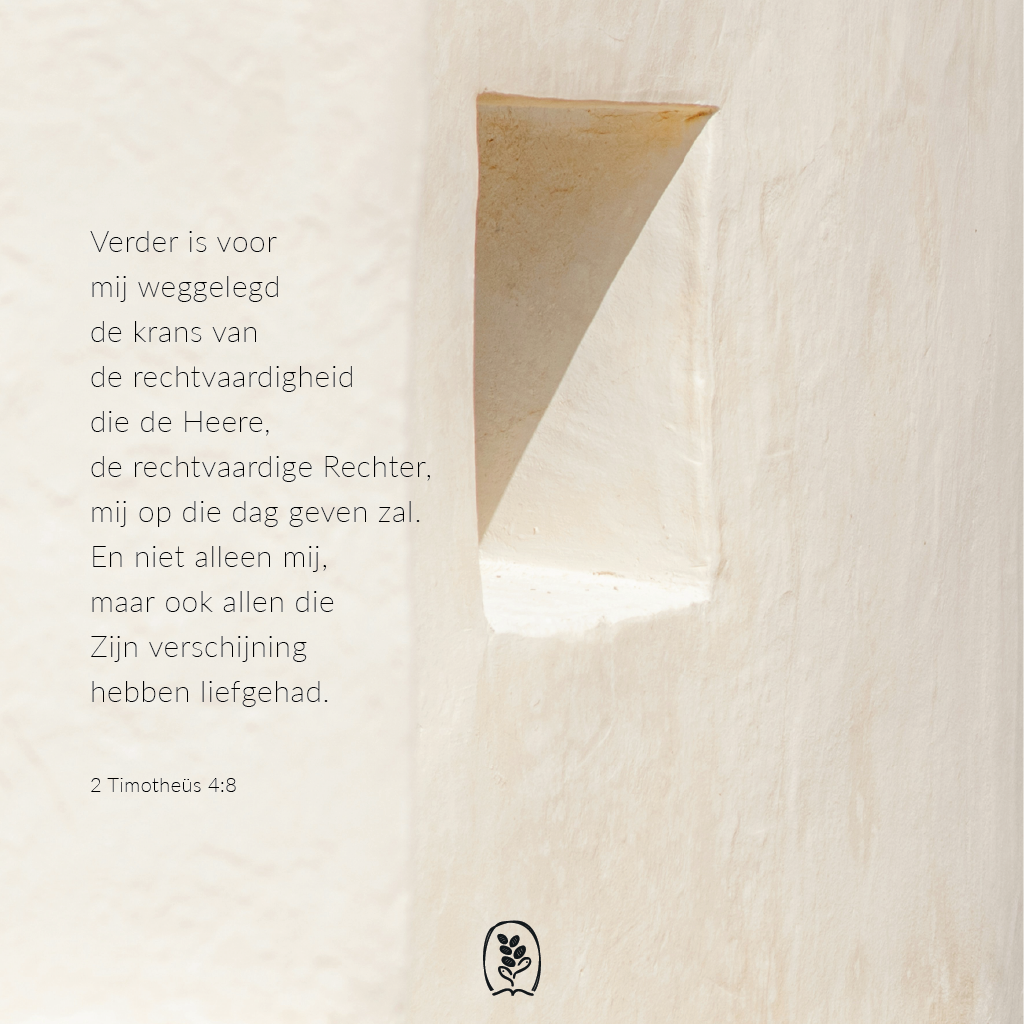 “Verder is voor mij weggelegd de krans van de rechtvaardigheid die de Heere, de rechtvaardige Rechter, mij op die dag geven zal. En niet alleen aan mij, maar ook allen die Zijn verschijning hebben liefgehad.” - Paulus
