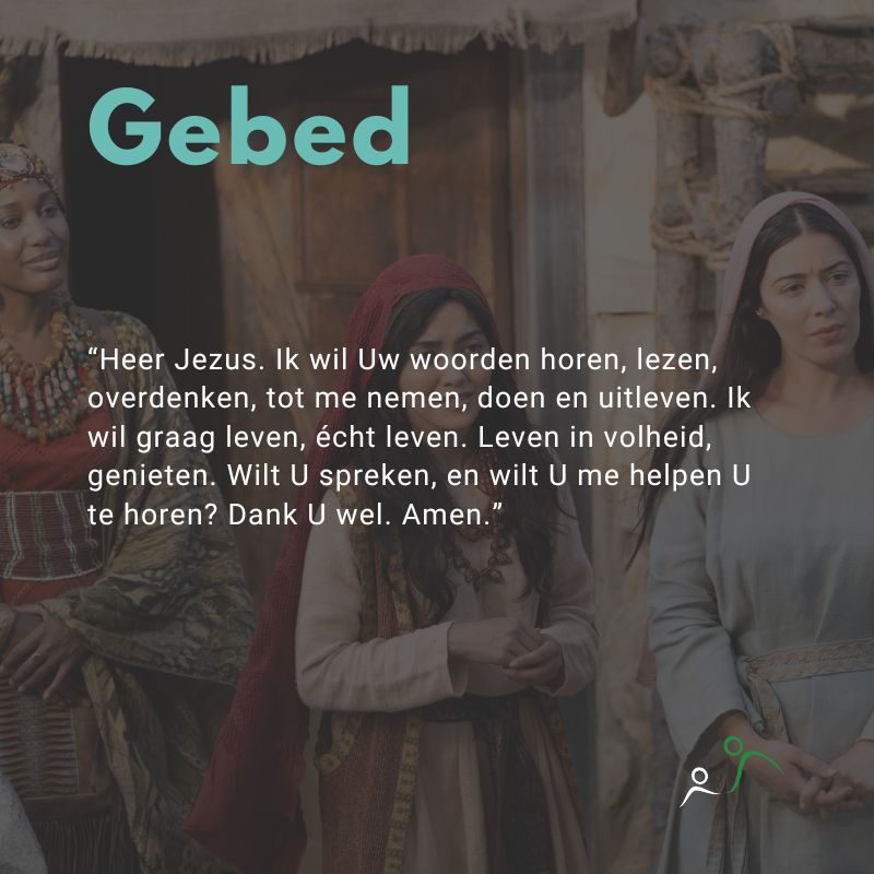 Gebed: “Heer Jezus. Ik wil Uw woorden horen, lezen, overdenken, tot me nemen, doen en uitleven. Ik wil graag leven, écht leven. Leven in volheid, genieten. Wilt U spreken, en wilt U me helpen U te horen? Dank U wel. Amen.”