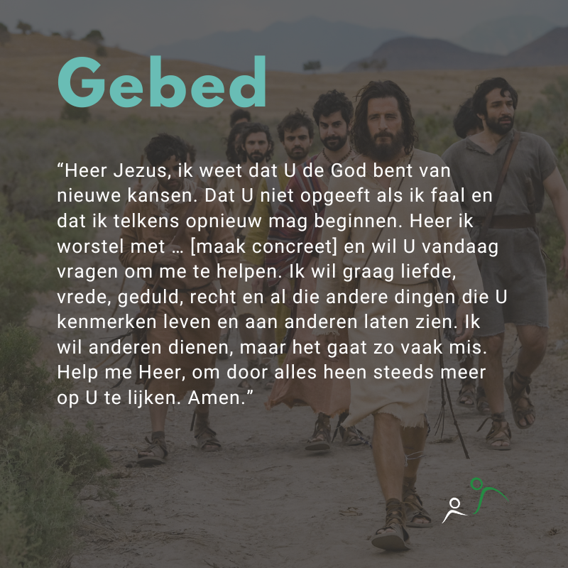Gebed: “Heer Jezus, ik weet dat U de God bent van nieuwe kansen. Dat U niet opgeeft als ik faal en dat ik telkens opnieuw mag beginnen. Heer ik worstel met … [maak concreet] en wil U vandaag vragen om me te helpen. Ik wil graag liefde, vrede, geduld, recht en al die andere dingen die U kenmerken leven en aan anderen laten zien. Ik wil anderen dienen, maar het gaat zo vaak mis. Help me Heer, en geef dat ik door alles heen steeds meer op U ga lijken. Amen.”