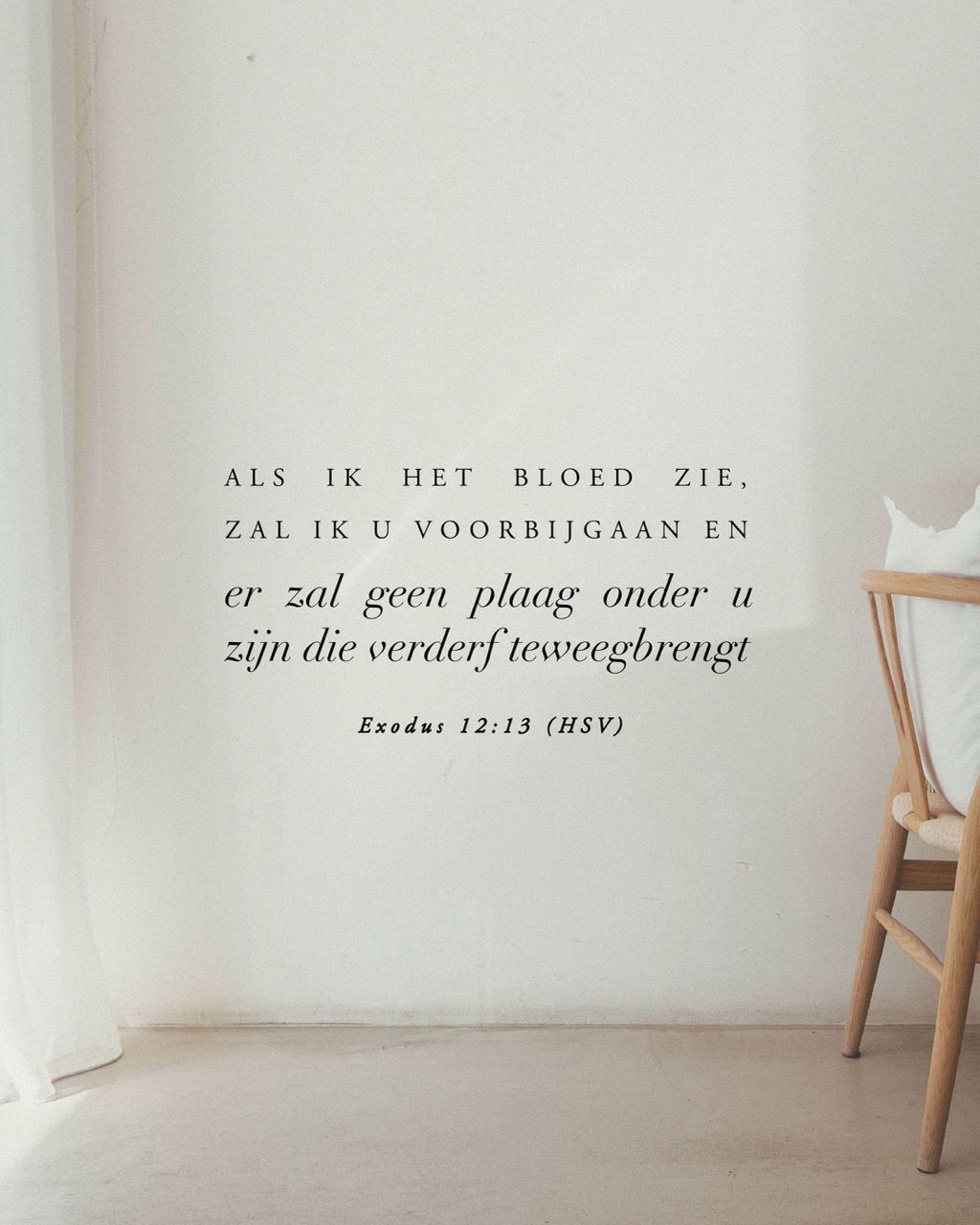 Het bloed van een lam was nodig om de doodsengel voorbij te laten gaan. Zo hebben ook wij een offerlam nodig dat ons van de dood redt: Jezus Christus. Wij kennen Hem als het Lam van God dat de zonden van de wereld wegneemt (Johannes 1:29). Zijn bloed bedekt onze zonden, zodat we door geloof vergeving ontvangen en een nieuw leven hebben. Prijs God voor ons ware Offerlam!
