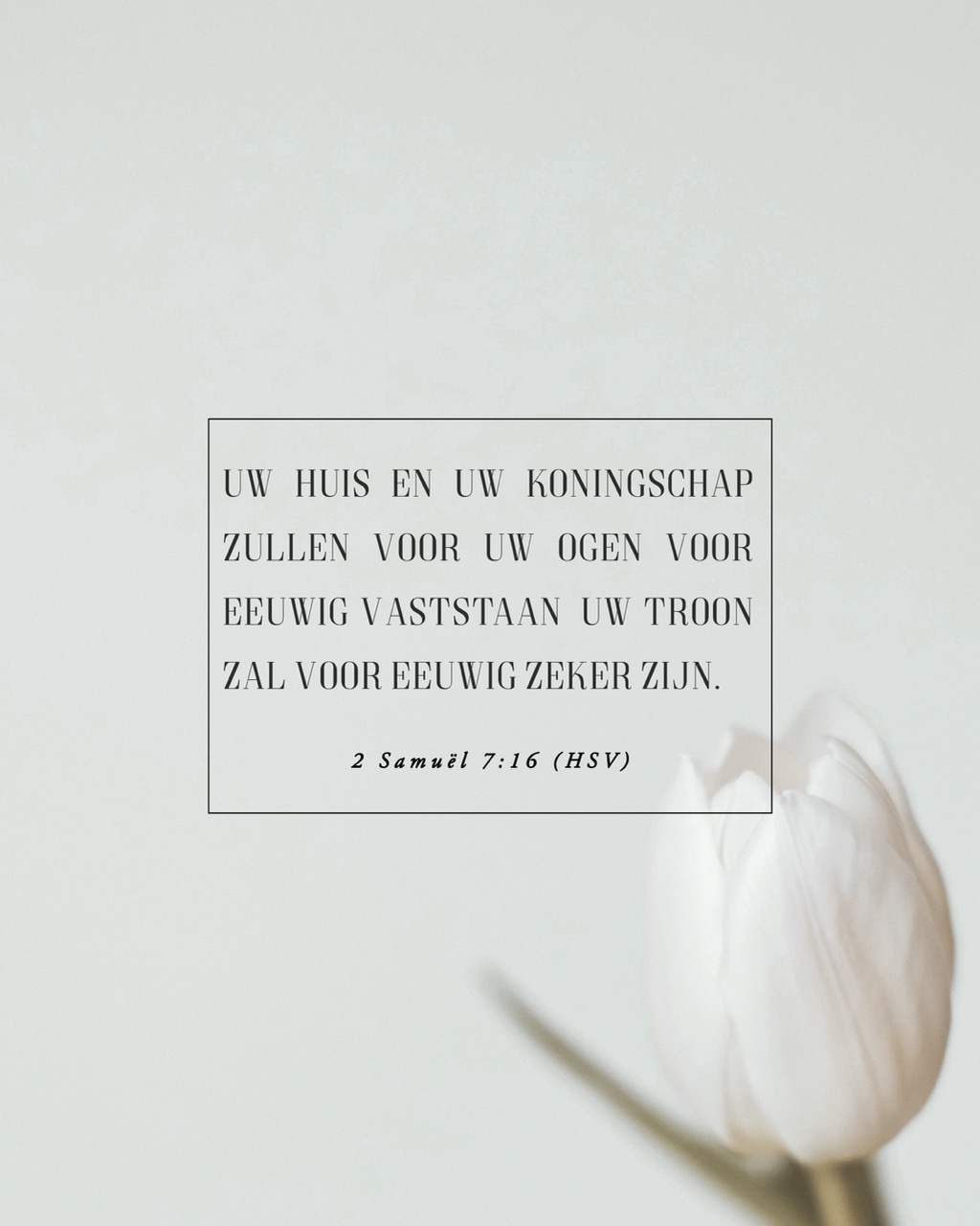 Niet David zou een huis voor God bouwen, maar God zou voor David een huis, een koninkrijk en een troon oprichten. God beloofde dat Davids zoon degene zou zijn die een tempel zou bouwen en dat het koninkrijk Israël vrede zou hebben met zijn vijanden. De grootste belofte die God deed, was dat een nakomeling van David voor altijd op de troon zou zitten.