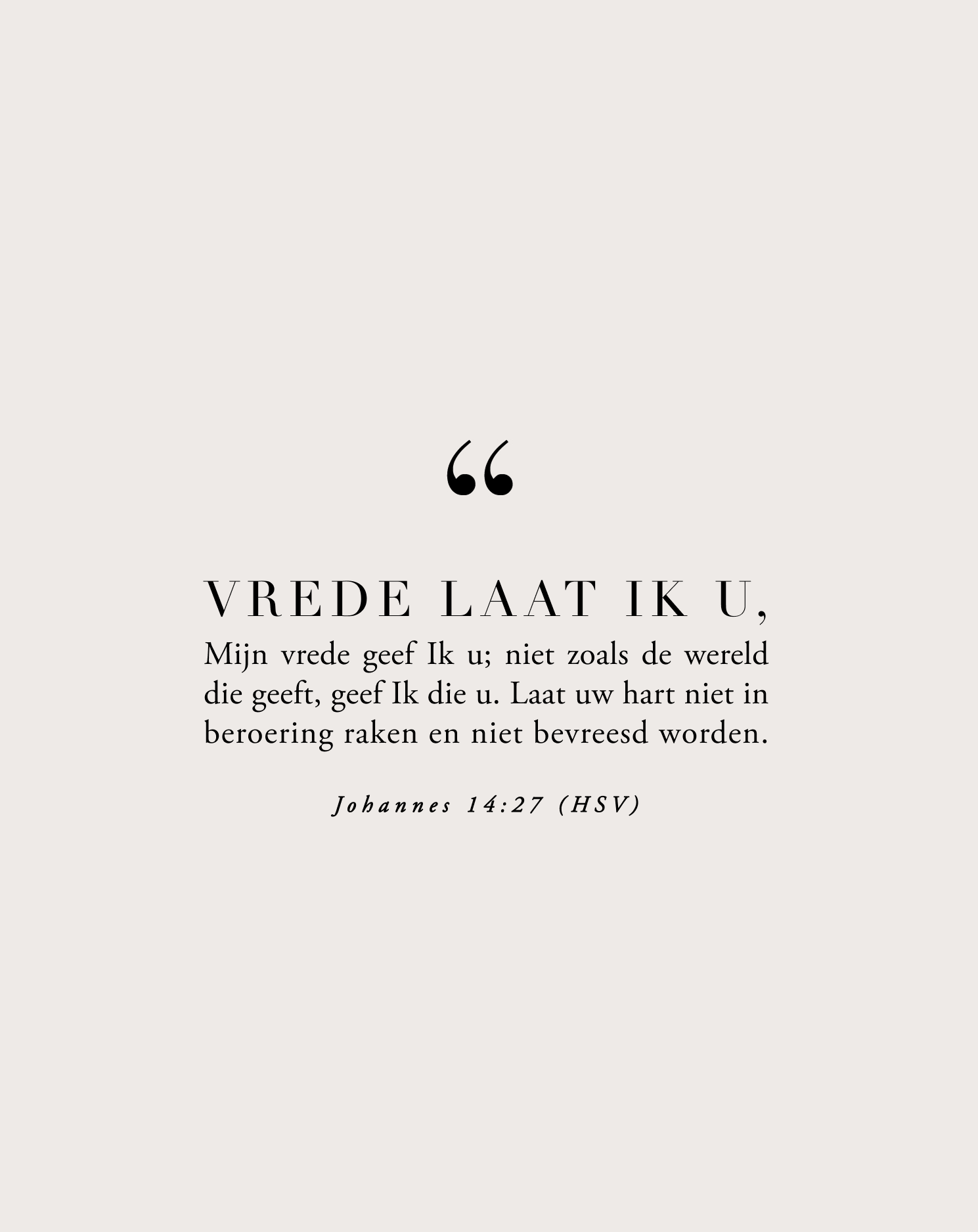 “Vrede laat Ik u, Mijn vrede geef Ik u; niet zoals de wereld die geeft, geef Ik die u. Laat uw hart niet in beroering raken en niet bevreesd worden.” (HSV)