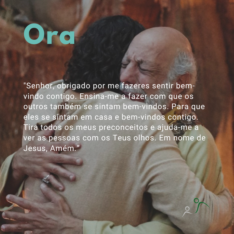 Ora: "Senhor, obrigado por me fazeres sentir bem-vindo contigo. Ensina-me a fazer com que os outros também se sintam bem-vindos. Para que eles se sintam em casa e bem-vindos Contigo. Tira todos os meus preconceitos e ajuda-me a ver as pessoas com os Teus olhos. Em nome de Jesus, Amém."