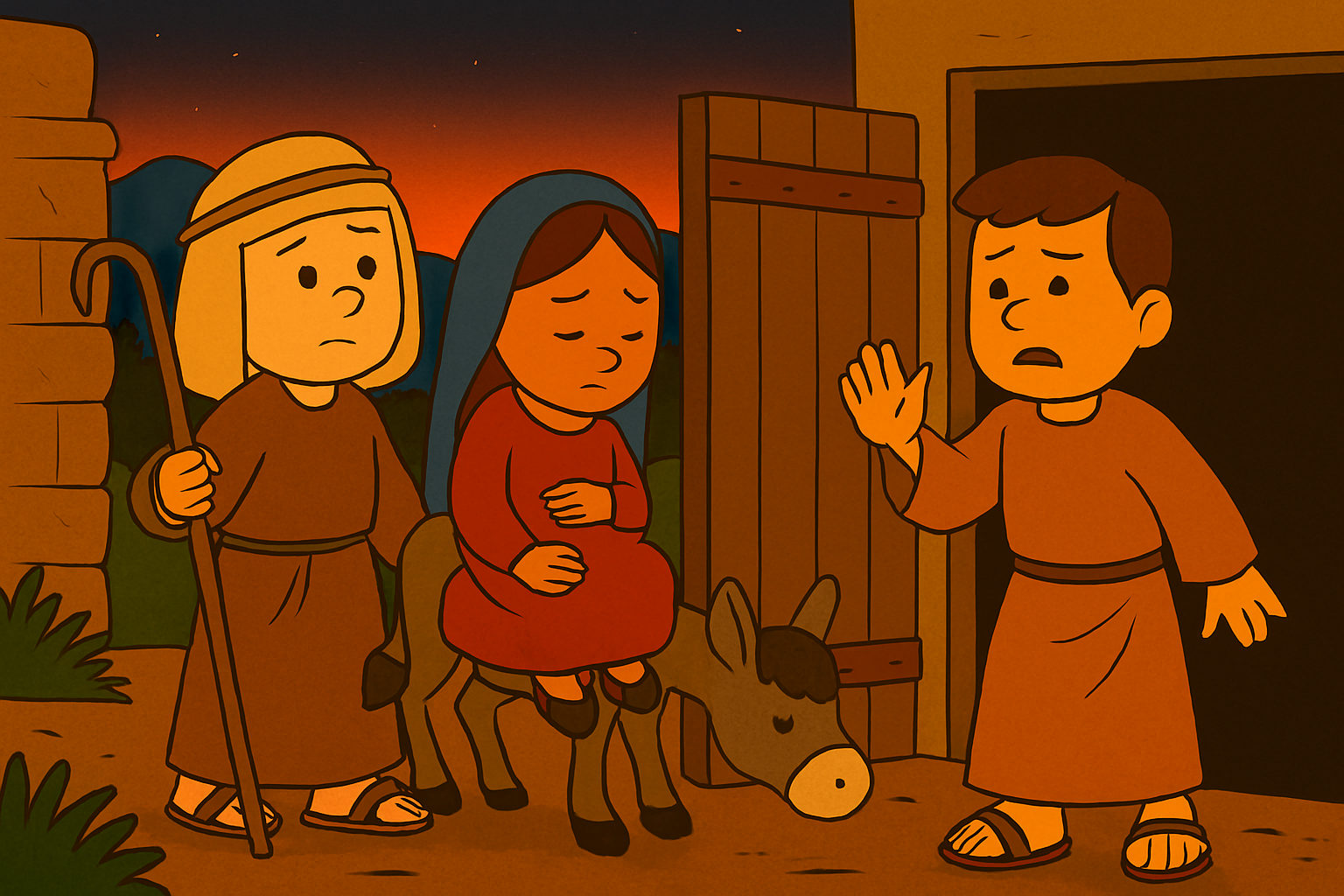 Maria e José chegaram a Belém depois de uma longa viagem. As ruas estavam cheias de pessoas que também tinham vindo por causa do recenseamento. Quando procuraram um lugar para descansar, todas as hospedarias estavam lotadas. José batia de porta em porta, mas sempre ouvia a mesma resposta: “Sinto muito, não há lugar.” Maria já sentia que o bebê estava quase nascendo, e mesmo assim ninguém tinha um cantinho para eles. O Filho de Deus estava chegando ao mundo, e não havia lugar para Ele!