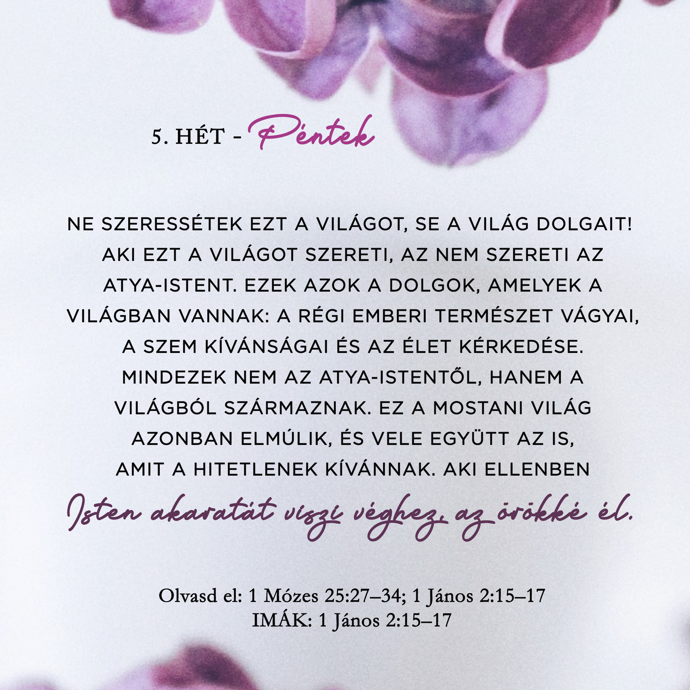 Uram, már nem akarok a világ dolgaira vágyni. Mutasd meg nekem azokat a dolgokat az életemben, amelyek világiak. Segíts eltávolítani ezeket, hogy teljes mértékben tisztelhesselek Téged, és olyan életet élhessek, amely csak Téged szolgál. Ámen.