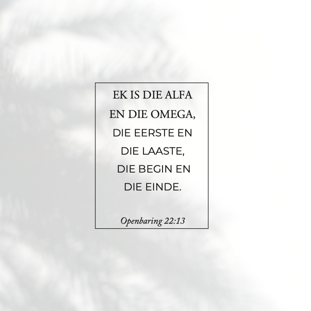 Jesus sê toe weer: “Kyk, Ek kom gou! Ek bring die loon saam met My om elkeen te beloon vir wat hy gedoen het. Ek is die Alfa en die Omega, die Eerste en die Laaste, die Begin en die Einde.