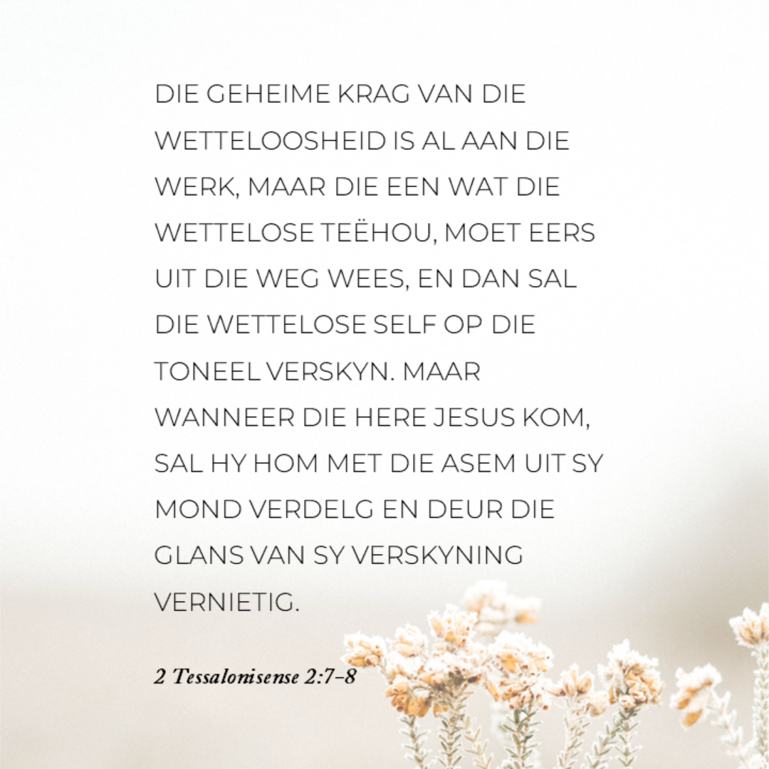 Die geheime krag van die wetteloosheid is al aan die werk, maar die een wat die wettelose teëhou, moet eers uit die weg wees, en dan sal die wettelose self op die toneel verskyn. Maar wanneer die Here Jesus kom, sal Hy hom met die asem uit sy mond verdelg en deur die glans van sy verskyning vernietig.