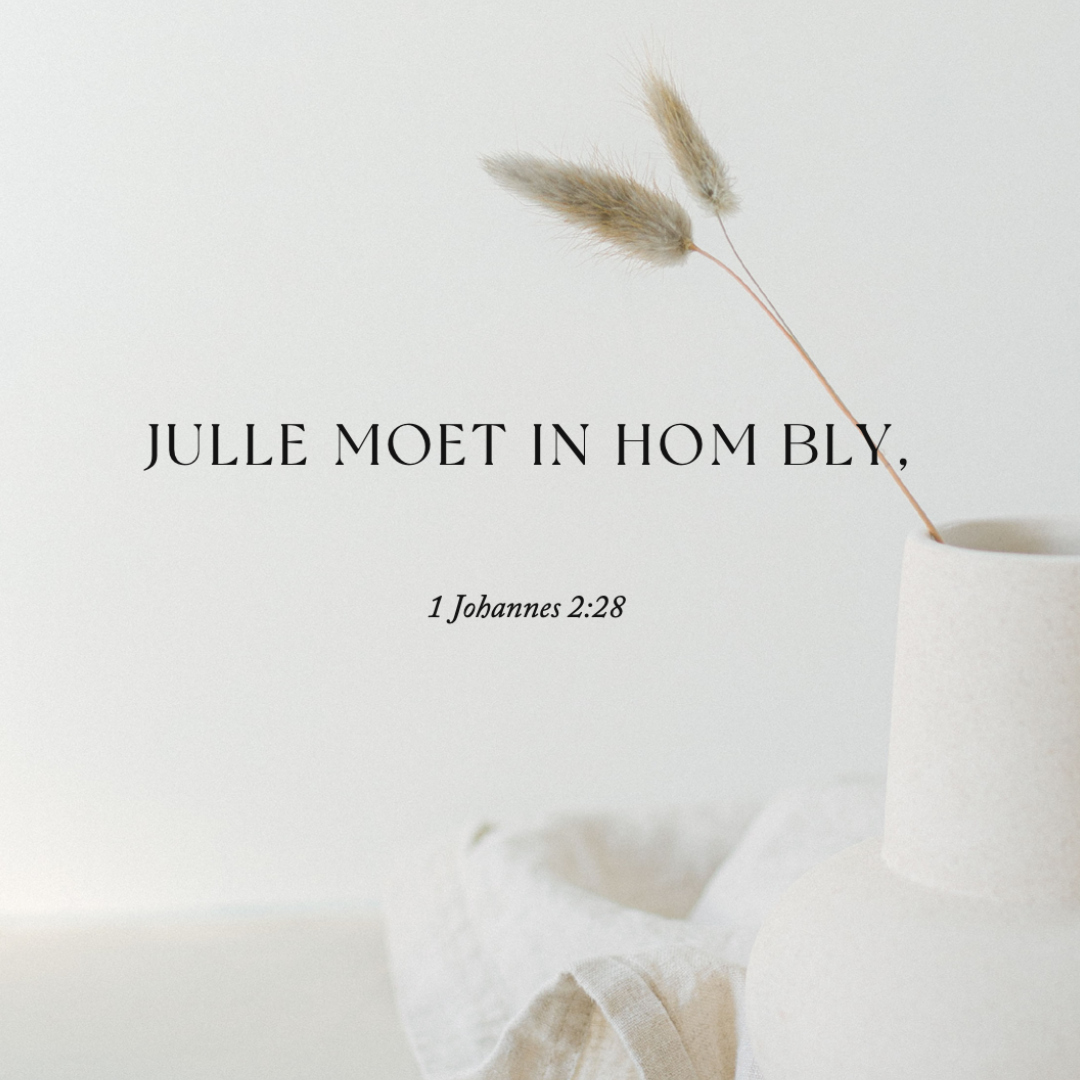 En nou, liewe kinders, julle moet in Hom bly, sodat ons almal niks te vrees sal hê wanneer Hy kom nie en by sy wederkoms nie beskaamd voor Hom sal staan nie.