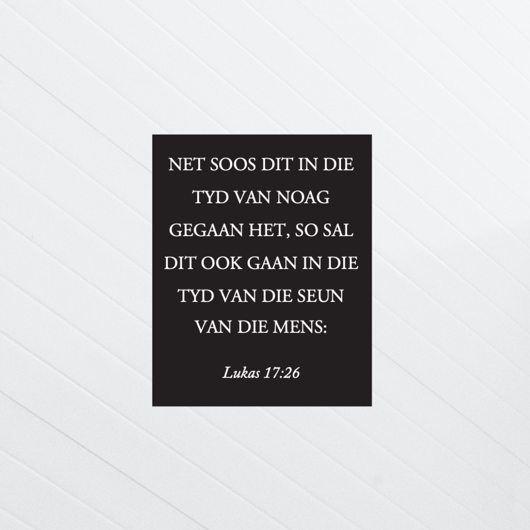 “Net soos dit in die tyd van Noag gegaan het, so sal dit ook gaan in die tyd van die Seun van die mens: hulle het maar soos gewoonlik geëet en gedrink en getrou tot op die dag dat Noag in die ark ingegaan het. Toe kom die sondvloed, en dit het hulle almal uitgewis.”