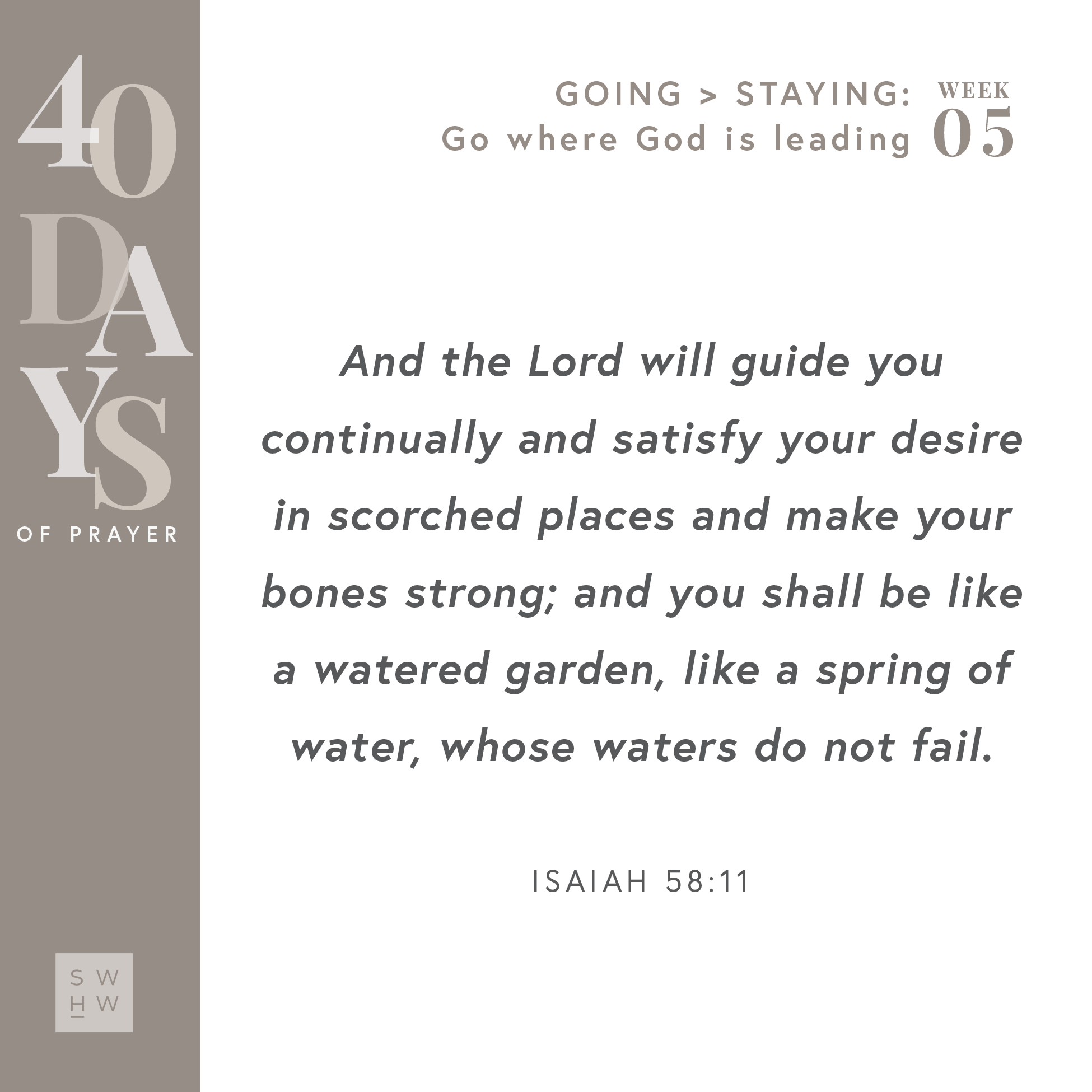 “And the Lord will guide you continually and satisfy your desire in scorched places and make your bones strong; and you shall be like a watered garden, like a spring of water, whose waters do not fail.” - Isaiah 58:11
