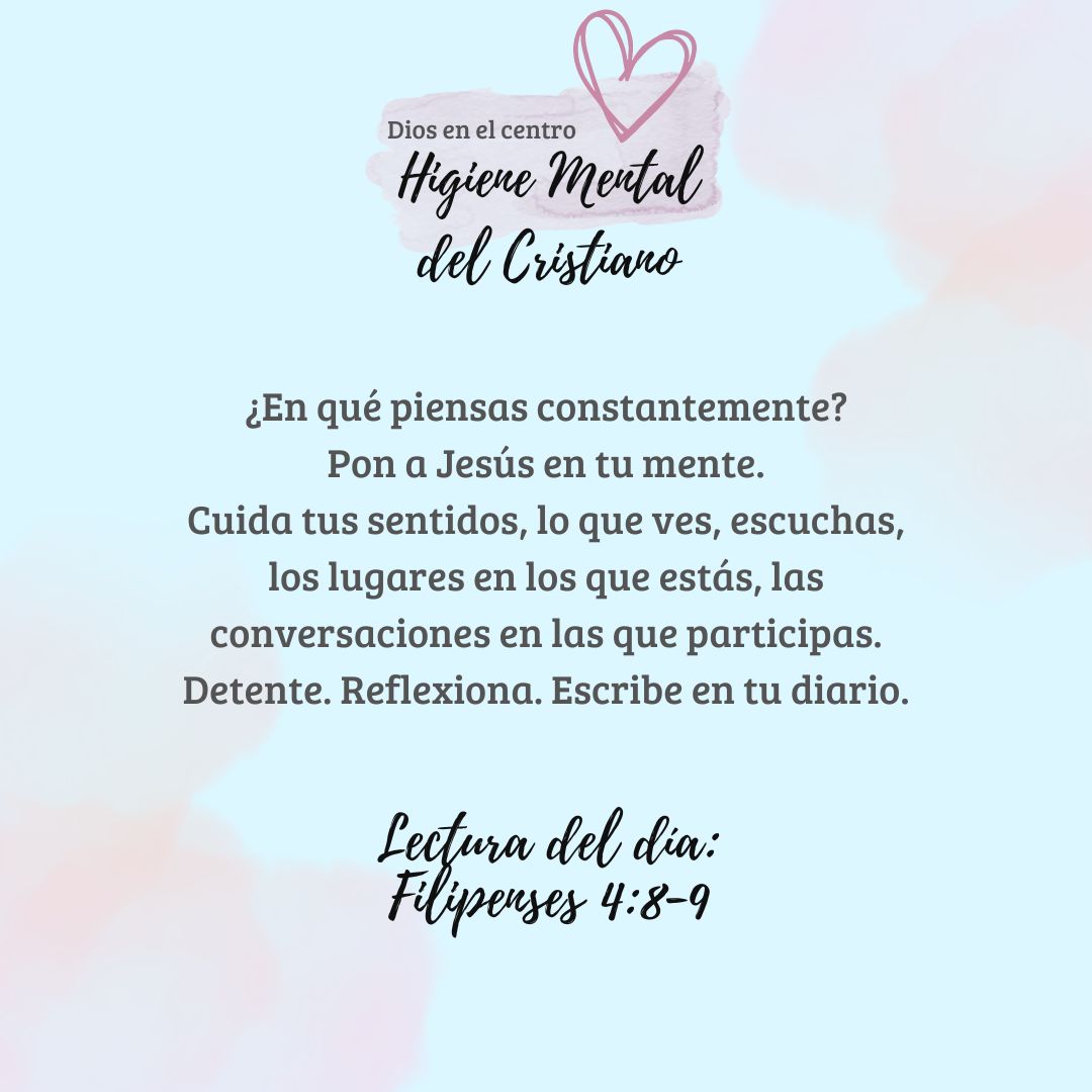 Este plan te lleva al centro: Dios. Higiene mental se define como la reducción o eliminación de lo que obstruye un equilibrio psicoemocional. La Biblia marca la ruta para tener una buena higiene mental, y aún más, la recomendada por nuestro Creador. ¿Quién sino Él para saber cómo funcionamos? La higiene que se alcanza en la mente, como consecuencia de la presencia de Dios como centro, es inigualable.