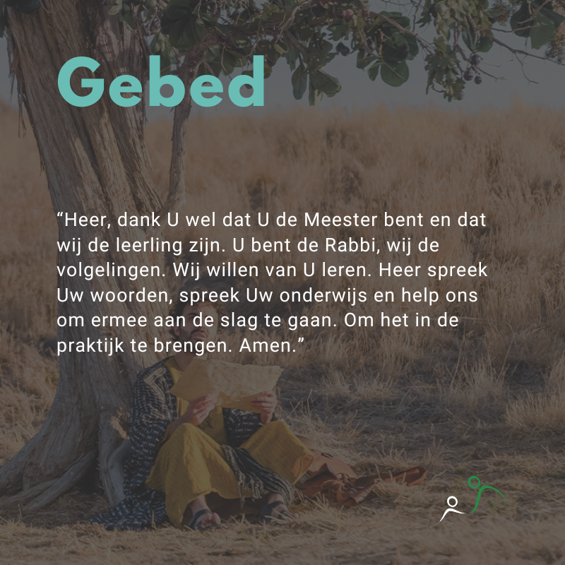 “Heer, dank U wel dat U de Meester bent en dat wij de leerling zijn. U bent de Rabbi, wij de volgelingen. Wij willen van U leren. Heer spreek Uw woorden, spreek Uw onderwijs en help ons om ermee aan de slag te gaan. Om het in de praktijk te brengen. Amen.”
