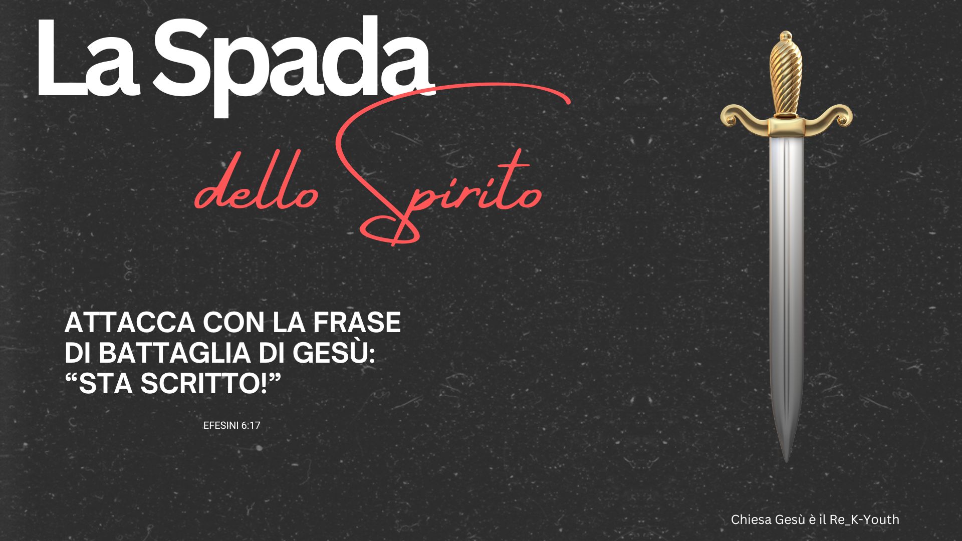 Finora abbiamo parlato di armi di difesa, ma bisogna anche attaccare se si vuole vincere, e la nostra arma per attaccare è una spada, ma non una spada qualunque, una spada a due tagli che è in grado di dividere il carnale dallo spirituale. Essa viene descritta come: vivente ed efficace, più affilata di qualunque spada a doppio taglio, e penetrante fino a dividere l'anima dallo spirito, le giunture dalle midolla; essa giudica i sentimenti e i pensieri del cuore. La spada romana era di solito a doppio taglio, cosa che la rendeva più efficace per trafiggere e tagliare da entrambi i lati. La Parola di Dio raggiunge il cuore, dividendo il carnale dallo spirituale, in questo modo svela tutti i sentimenti e tutti i pensieri di coloro che tocca. Lo scopo della Spada dello Spirito, cioè la Bibbia, è quello di renderci forti e di permetterci di far fronte agli attacchi del diavolo, il nostro nemico. Leggiamo la Parola, mettiamola in pratica nel bel mezzo dell’attacco del nemico, così come faceva Gesù, che rispondeva: "Sta scritto!