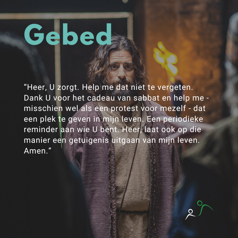 Gebed: “Heer, U zorgt. Help me dat niet te vergeten. Dank U voor het cadeau van sabbat en help me - misschien wel als een protest voor mezelf - dat een plek te geven in mijn leven. Een periodieke reminder aan wie U bent. Heer, laat ook op die manier een getuigenis uitgaan van mijn leven. Amen.”