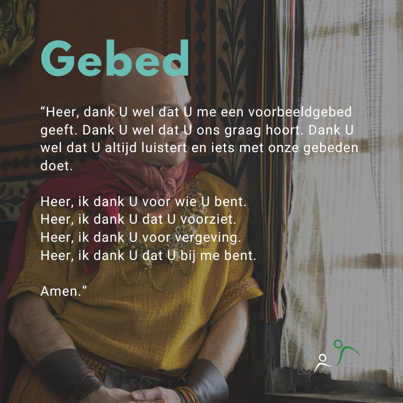 Gebed: “Heer, dank U wel dat U me een voorbeeldgebed geeft. Dank U wel dat U ons graag hoort. Dank U wel dat U altijd luistert en dat U iets met onze gebeden hoort.