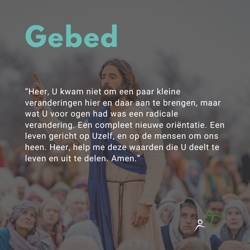 Gebed: “Heer, U kwam niet om een paar kleine veranderingen hier en daar aan te brengen, maar wat U voor ogen had was een radicale verandering. Een compleet nieuwe oriëntatie. Een leven gericht op Uzelf, en op de mensen om ons heen. Heer, help me deze waarden die U deelt te leven en uit te delen. Amen.”