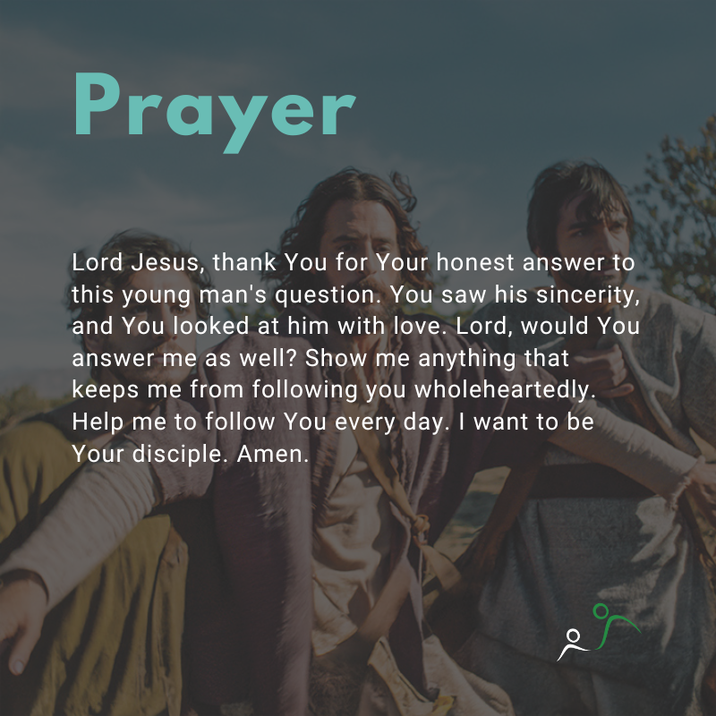 Lord Jesus, thank You for Your honest answer to this young man's question. You saw his sincerity, and You looked at him with love. Lord, would You answer me as well? Show me anything that keeps me from following you wholeheartedly. Help me to follow You every day. I want to be Your disciple. Amen.