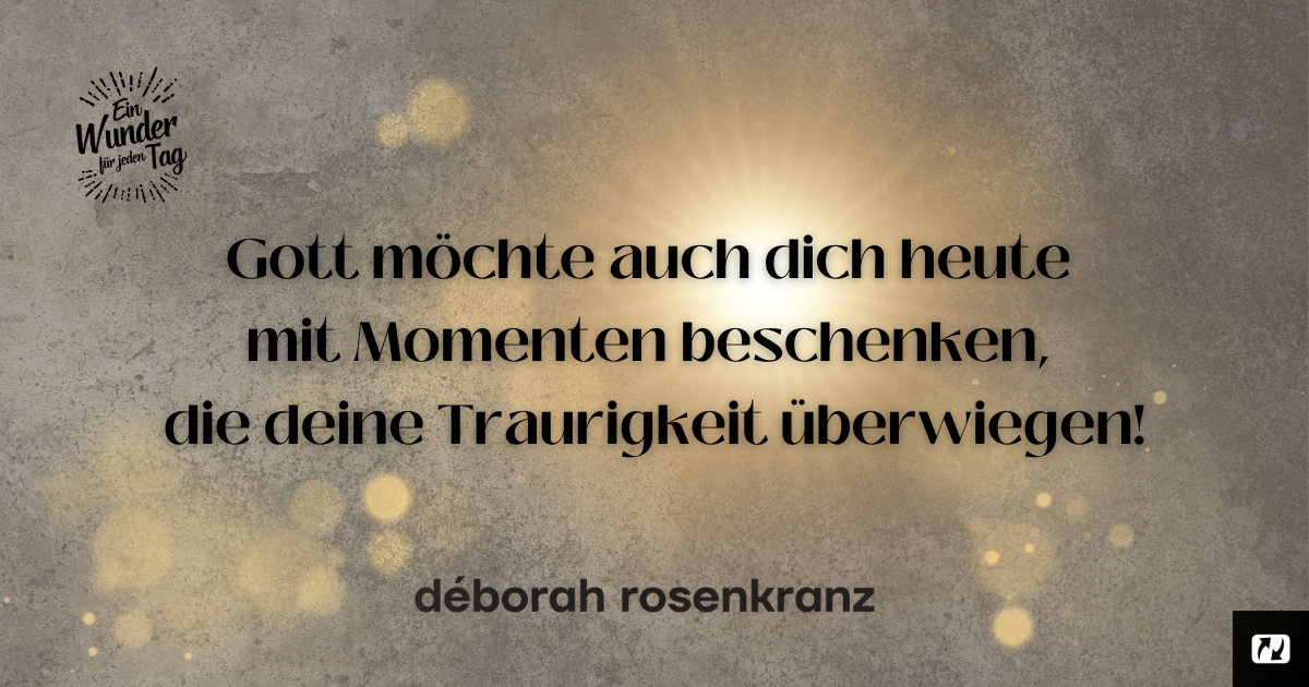 Und, Gott möchte auch dich heute mit solchen Momenten beschenken! Momenten, die deine Traurigkeit überwiegen. Momente, die wertvoller sind als: „Was esse ich heute? Wie werde ich durchkommen?“ (siehe Matthäus 6,25 HfA)