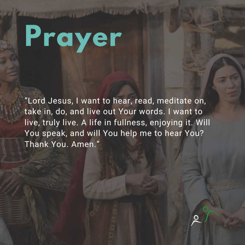 Prayer: “Lord Jesus, I want to hear, read, meditate on, take in, do, and live out Your words. I want to live, truly live a life in fullness, enjoying it. Will You speak, and will You help me to hear You? Thank You. Amen.”