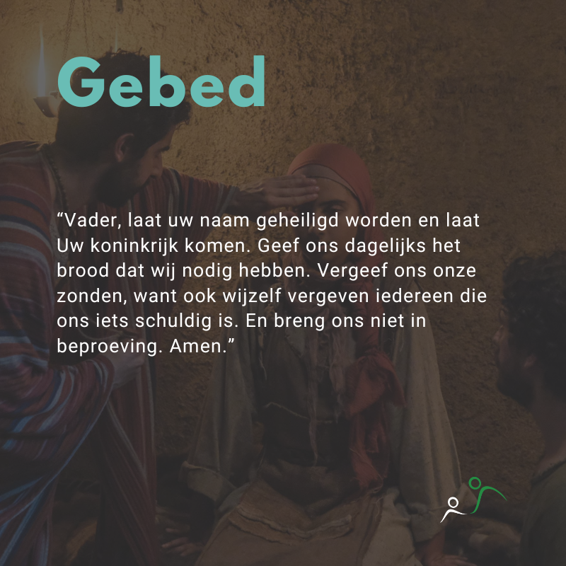 Gebed: "Vader, laat uw naam geheiligd worden en laat Uw koninkrijk komen. Geef ons dagelijks het brood dat wij nodig hebben. Vergeef ons onze zonden, want ook wijzelf vergeven iedereen die ons iets schuldig is. En breng ons niet in beproeving. Amen."