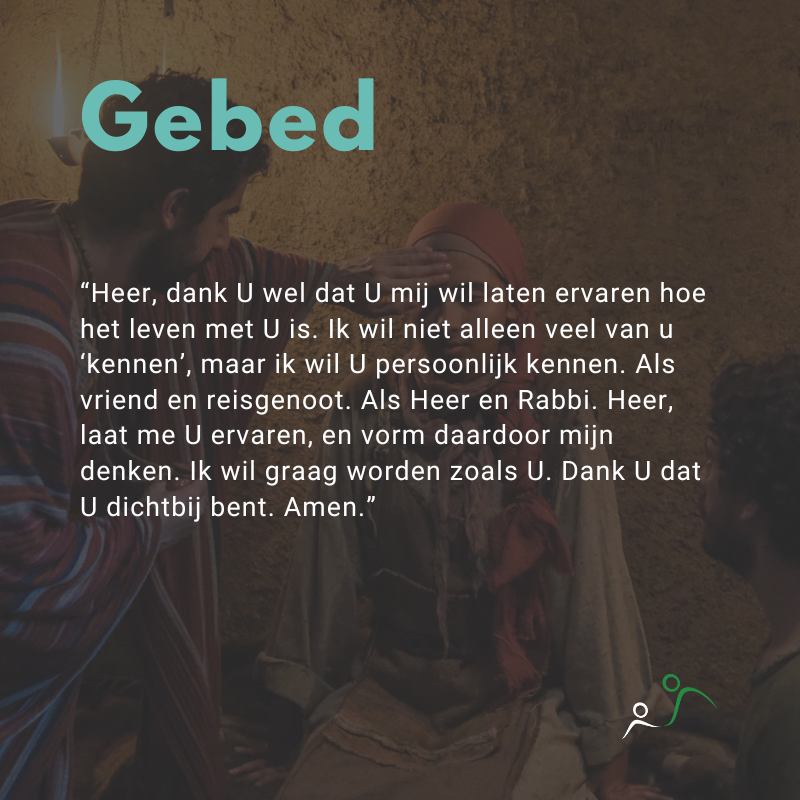 Gebed: "Heer, dank U wel dat U mij wil laten ervaren hoe het leven met U is. Ik wil niet alleen veel van u 'kennen', maar ik wil U persoonlijk kennen. Als vriend en reisgenoot. Als Heer en Rabbi. Heer, laat me U ervaren, en vorm daardoor mijn denken. Ik wil graag worden zoals U. Dank U dat U dichtbij bent. Amen."