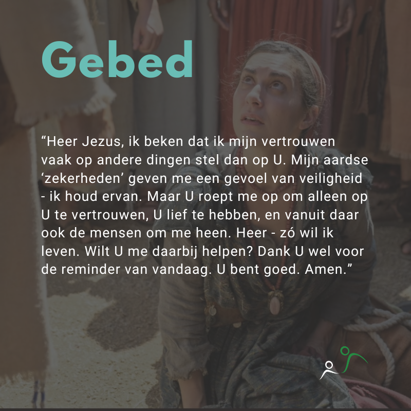 Gebed: “Heer Jezus, ik beken dat ik mijn vertrouwen vaak op andere dingen stel dan op U. Mijn aardse ‘zekerheden’ geven me een gevoel van veiligheid - ik houd ervan. Maar U roept me op om alleen op U te vertrouwen, U lief te hebben, en vanuit daar ook de mensen om me heen. Heer - zó wil ik leven. Wilt U me daarbij helpen? Dank U wel voor de reminder van vandaag. U bent goed. Amen.”