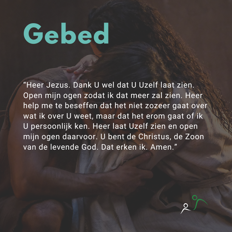 Gebed: “Heer Jezus. Dank U wel dat U Uzelf laat zien. Open mijn ogen zodat ik dat meer zal zien. Heer help me te beseffen dat het niet zozeer gaat over wat ik over U weet, maar dat het erom gaat of ik U persoonlijk ken. Heer laat Uzelf zien en open mijn ogen daarvoor. U bent de Christus, de Zoon van de levende God. Dat erken ik. Amen.”