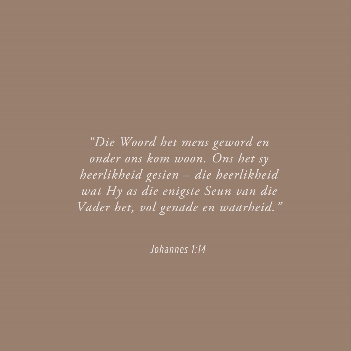 “Die Woord het mens geword en onder ons kom woon. Ons het sy heerlikheid gesien – die heerlikheid wat Hy as die enigste Seun van die Vader het, vol genade en waarheid.”