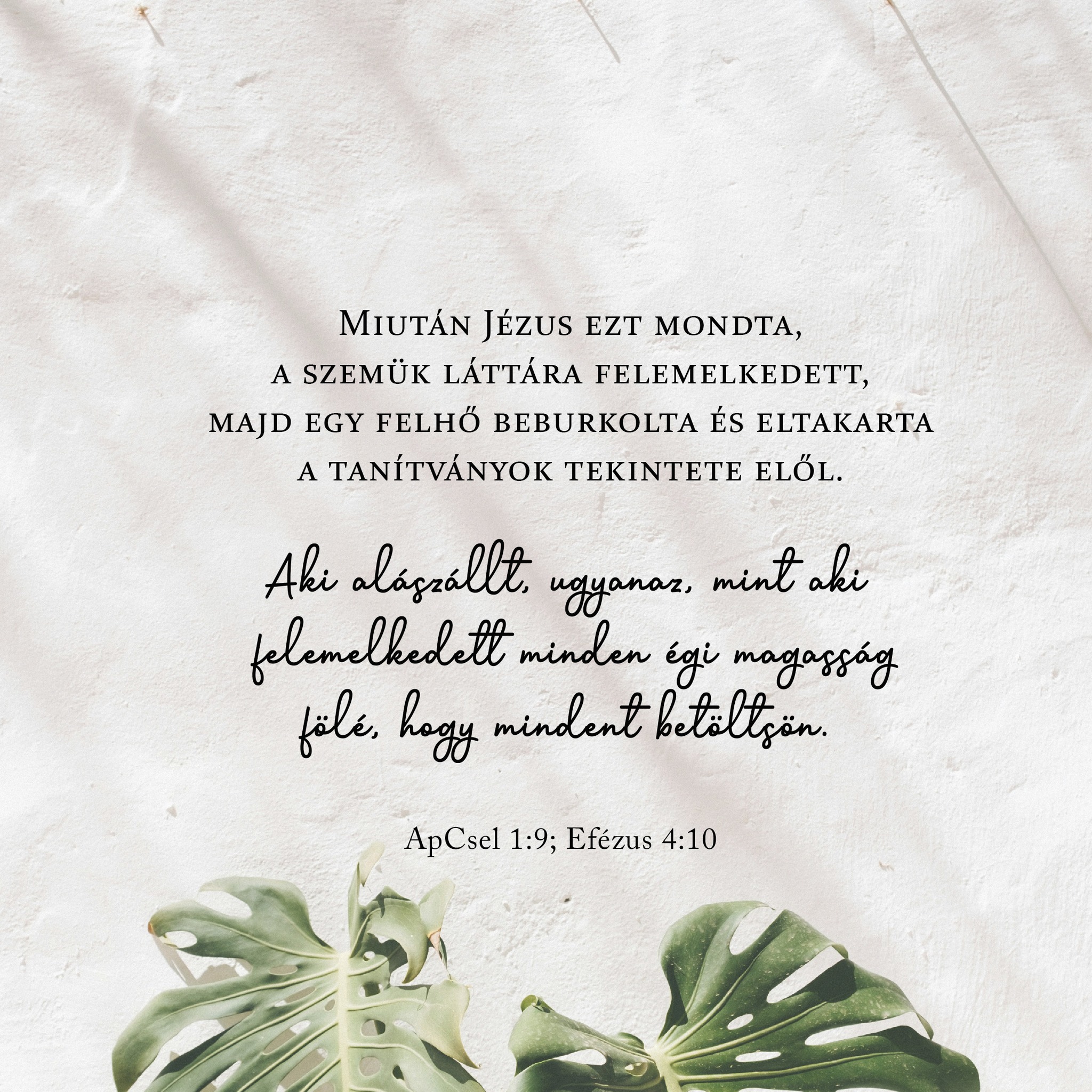 „Aki alászállt, ugyanaz, mint aki felemelkedett minden égi magasság fölé, hogy mindent betöltsön.” (Efézus 4:10)