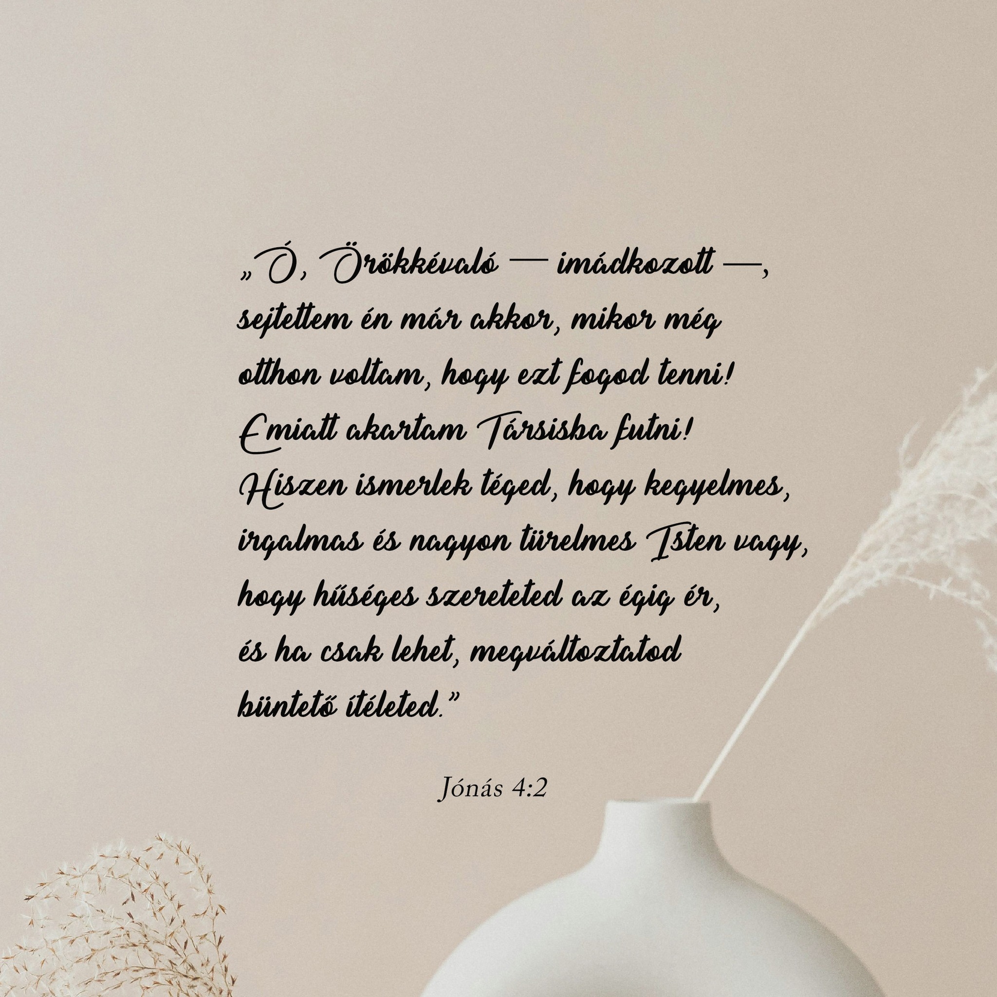 „Ó, Örökkévaló — imádkozott —, sejtettem én már akkor, mikor még otthon voltam, hogy ezt fogod tenni! Emiatt akartam Társisba futni! Hiszen ismerlek téged, hogy kegyelmes, irgalmas és nagyon türelmes Isten vagy, hogy hűséges szereteted az égig ér, és ha csak lehet, megváltoztatod büntető ítéleted.”